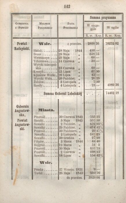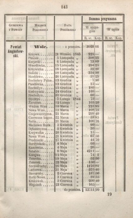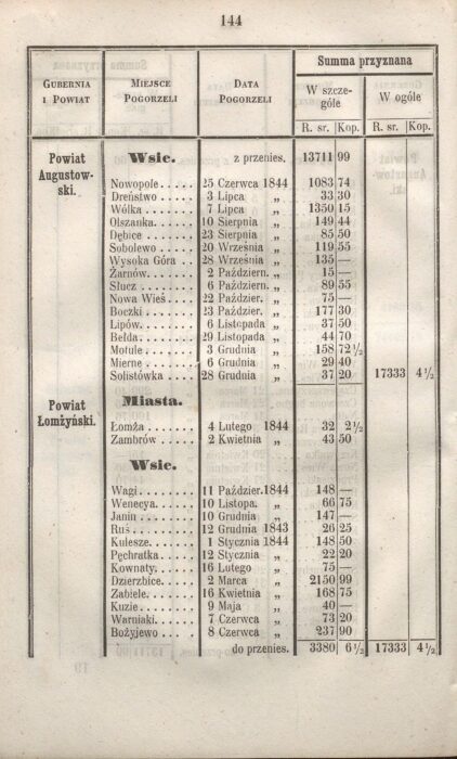 Plagą minionych czasów były nie tylko wojny, zarazy, ale także jeszcze częstsze pożary. „Zbiór Urządzeń i Wiadomości Tyczących się Ubezpieczeń w Królestwie Polskiem” z roku 1846. Przyznane odszkodowania po pogorzeli w miastach i wsiach powiatu augustowskiego.