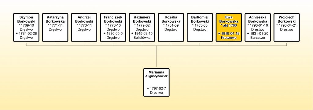 Mój przodek Antoni Borkowski zmarł w 1812 r. Jego druga żona – Katarzyna Radziwił – nie mogła być matką Ewy. Ale z pierwszego małżeństwa z Marianną Augustyn mógł mieć córkę Ewę. Luki w metrykach XVIII wieku to rzecz powszednia.