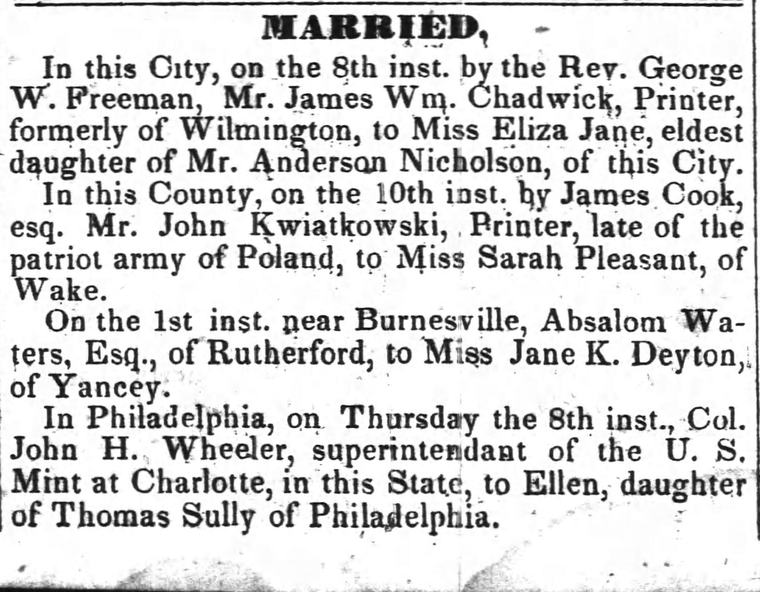 Jak już wspominałam, Jan osiedlił się w Północnej Karolinie. W 1838 roku, w hrabstwie Wake, poślubił Sarah Pleasant. Z tego małżeństwa przyszło na świat trzynaścioro dzieci (a przynajmniej tyle udało mi się odnaleźć), z których część – jak to często bywało w tamtych czasach – zmarła w dzieciństwie. Jan i Sarah przeżyli wojnę secesyjną, mieszkając w stanie opowiadającym się po stronie Konfederacji (Południa). Jeden z jego potomków wspomniał, że posiadał on niewolnicę.
