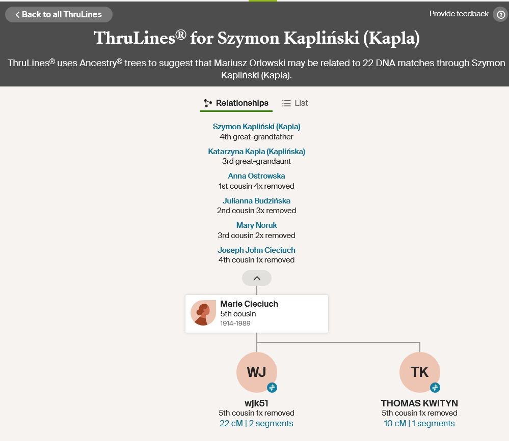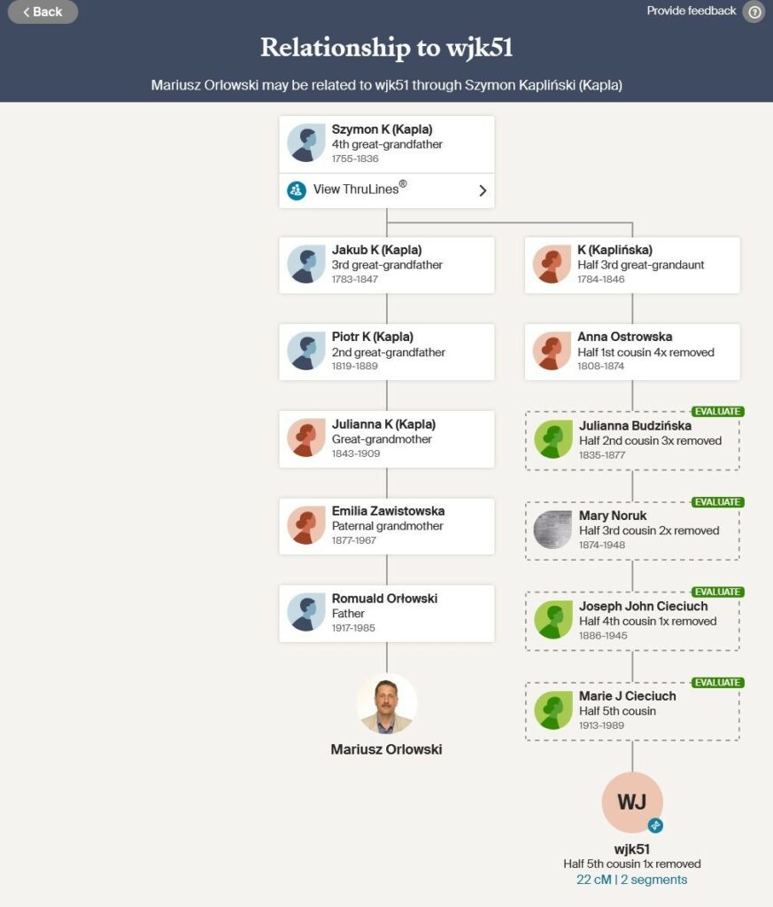 Szczególnie interesujące okazały się wyniki porównań genetycznych. Wykazały one, że potomkowie jego brata Józefa są ze mną spokrewnieni. Dodatkowo program ThruLines, dostępny na portalu Ancestry.com, pozwolił precyzyjnie określić stopień tego pokrewieństwa oraz odtworzyć powiązania rodzinne (schematy poniżej).