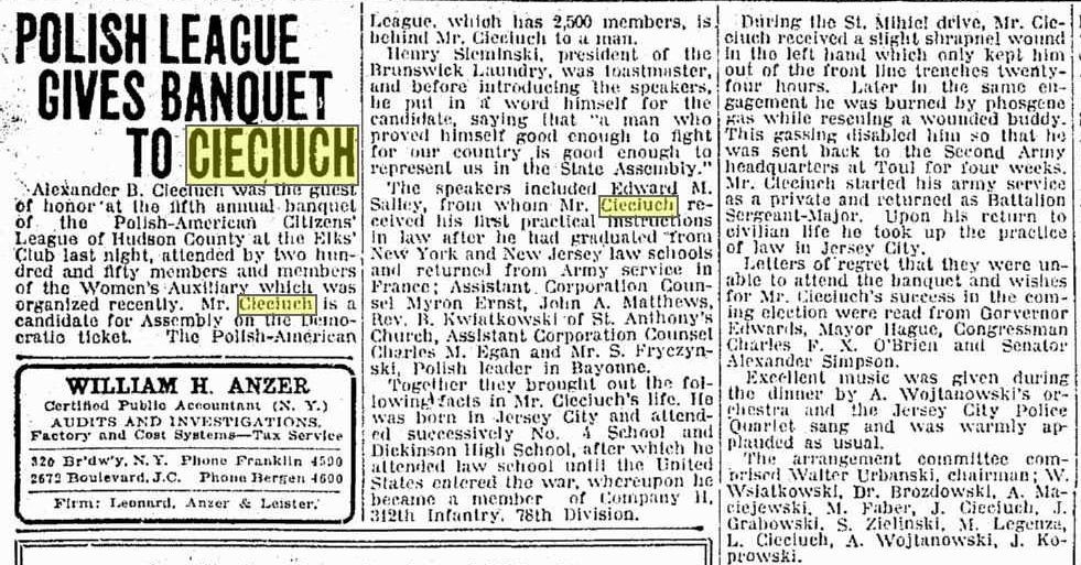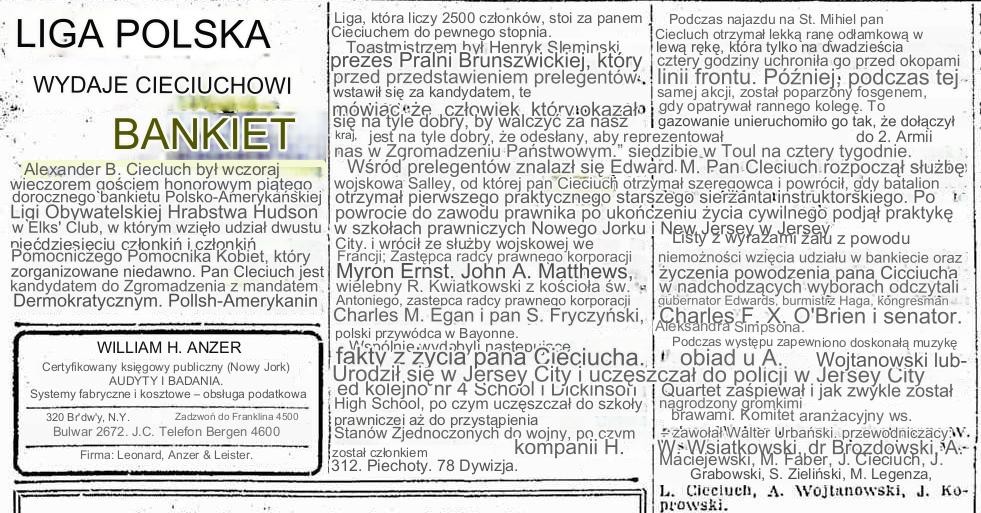 Na wspomnianym bankiecie z okazji 15-lecia jego audycji, który odbył się w nowojorskim hotelu McAlpin (dziś Herald Towers), na rogu ulic 34 i Broadway, bawiło się czterysta osób. W przemówieniach walory jubilata podkreślał Józef Lang, zarządca stacji WHOM, a także konsul A. Jachimowicz. Pierwszy mówił o pracowitości, grzeczności i światłości, drugi wskazywał na zasługi Cieciucha dla spraw polskich i znaczenie radia, jako czynnika informacyjnego. Energiczny, ruchliwy i ogólnie lubiany, zjednujący sobie wielu przyjaciół nad Wisłą – to z kolei określenia, które padały przy okazji organizowanych przez niego, z ramienia Stowarzyszenia Synów Polski, wycieczek do Ojczyzny. Na pokładzie „Batorego” przybywał do Gdyni w latach 1936, 1937, 1938 i 1939. Tam następował podział – większa część wyruszała do swoich rodzin, a kilkudziesięcioosobowa grupa jechała do Poznania, Częstochowy, Krakowa, Zakopanego, Lwowa, Wilna i Warszawy. Przy okazji pobytów w kraju Cieciuch rozmawiał z polskimi dziennikarzami o tym, co można usłyszeć w jego programie.