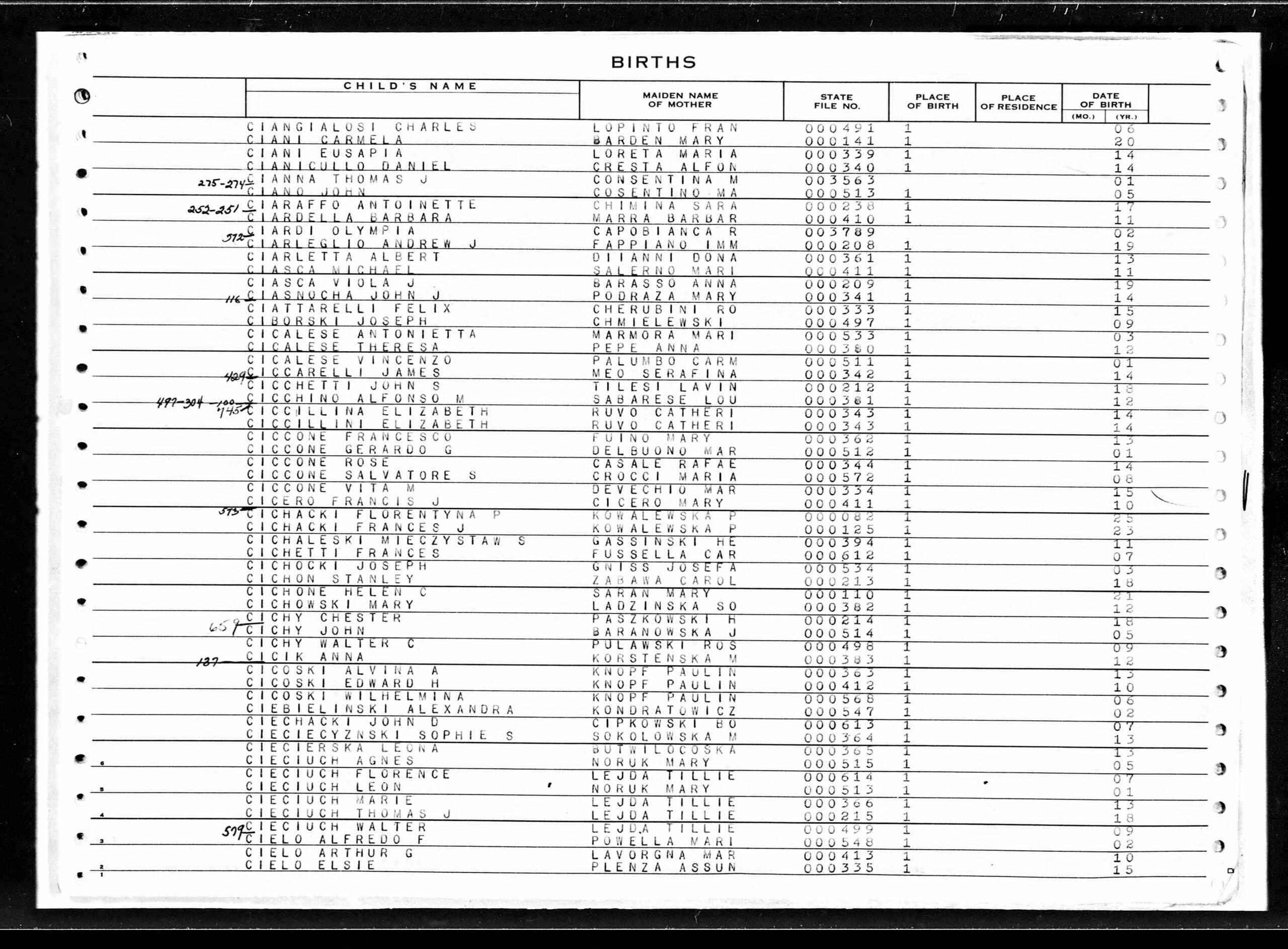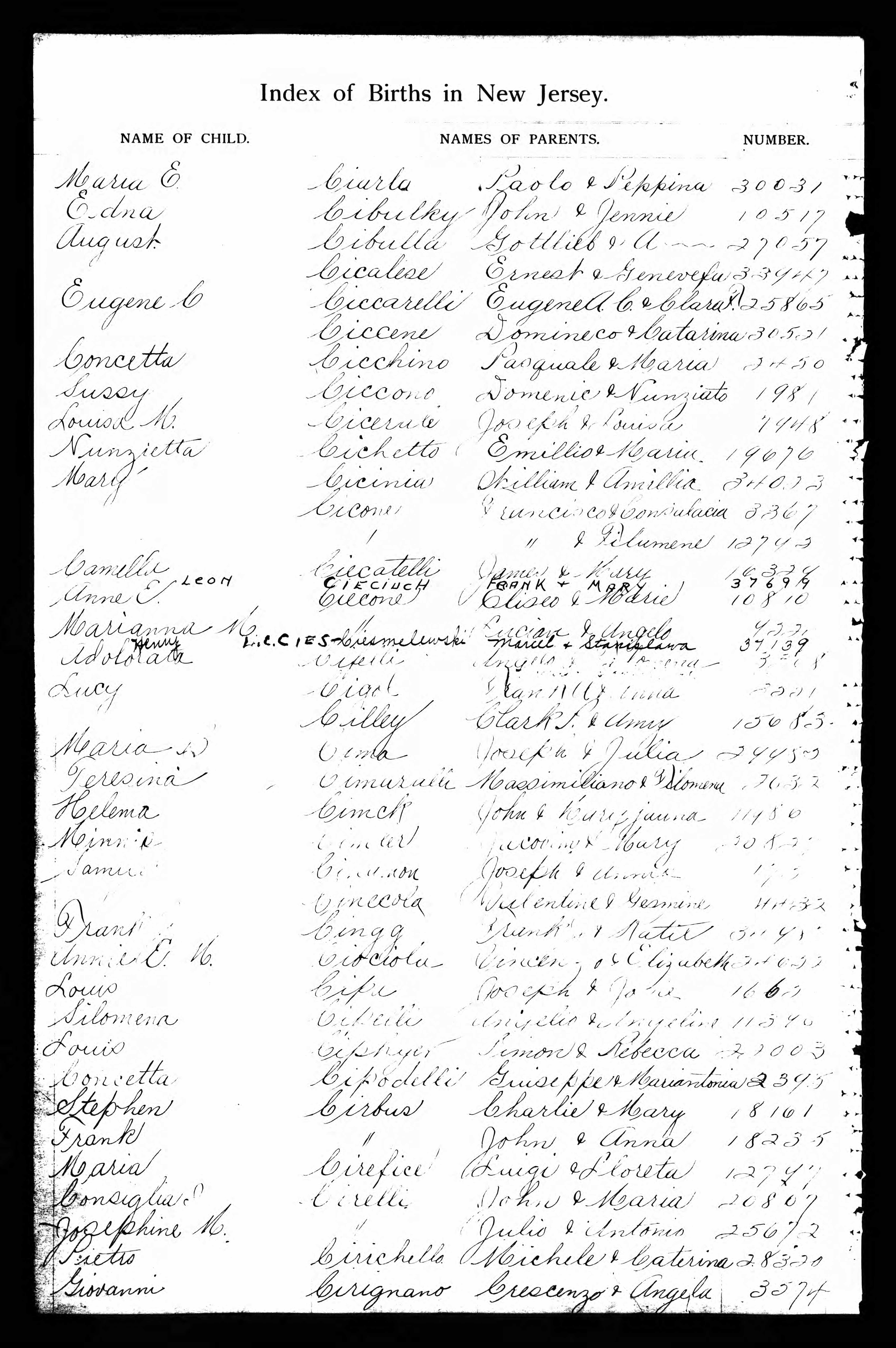 Indeks urodzonych w Jersey City z 1901 r., na których widnieje Leon Cieciuch; domena publiczna