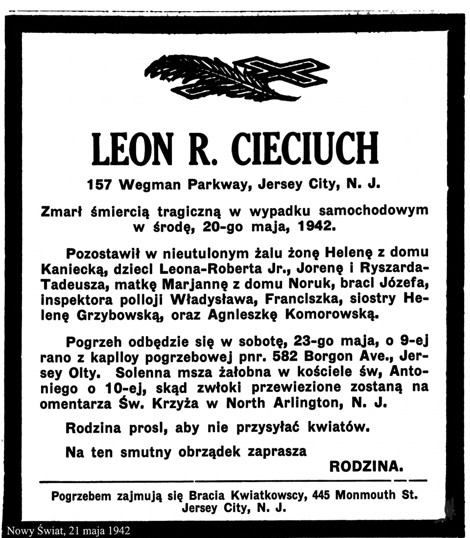 Leon Cieciuch, dyrektor polskiego oddziału WHOM w Jersey City i spiker radiowy z 15-letnim doświadczeniem, zginął tragicznie 20 maja 1942 r. w wypadku samochodowym w pobliżu lotniska Newark. Doszło tam do czołowego zderzenia z ciężarówką, w wyniku którego poniósł śmierć na miejscu.
