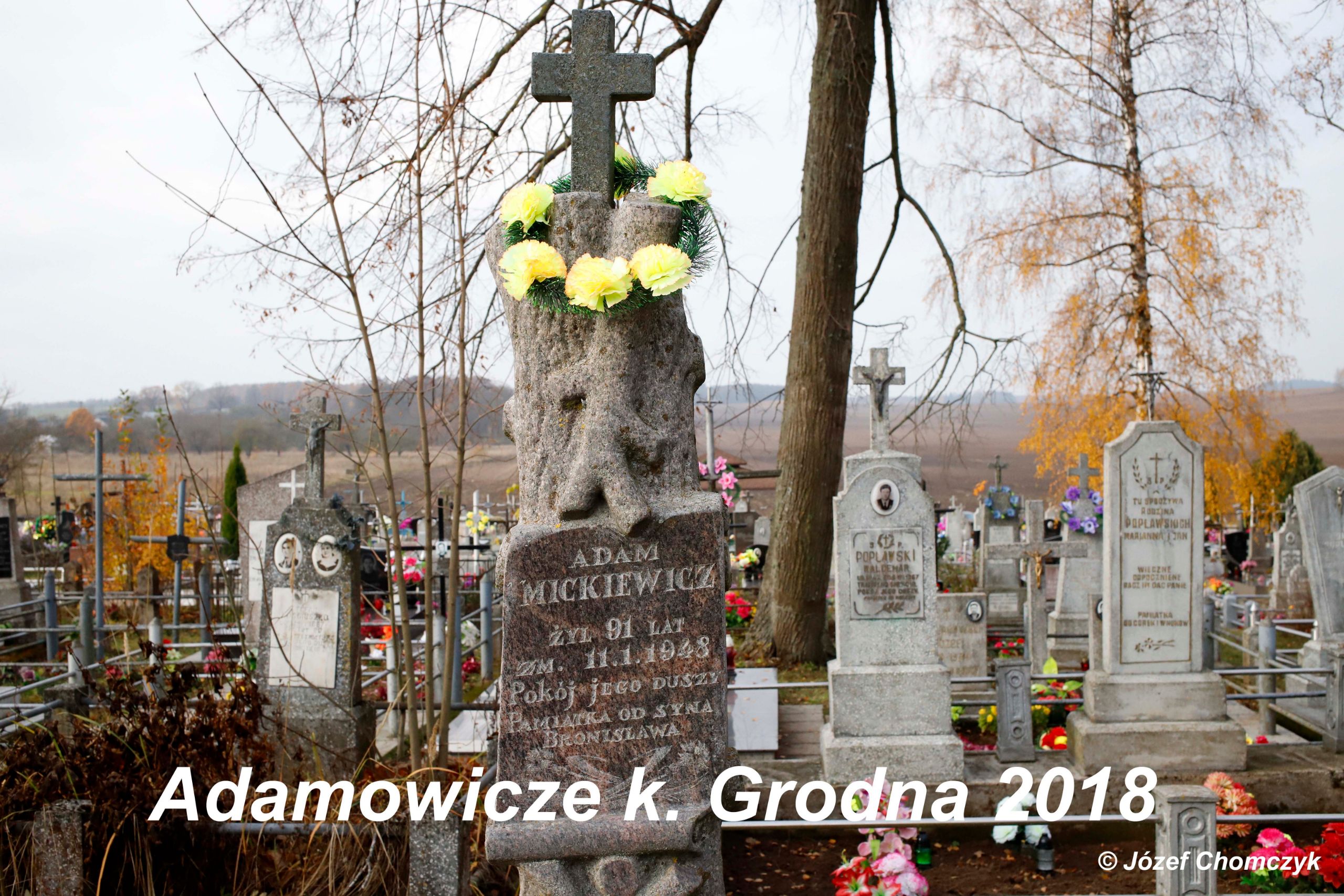 Udostępniamy spis osób pochowanych na cmentarzu parafialnym w Adamowiczach, przekazany nam przez Pana Józefa Chomczyka. Dokumentacja wraz z fotografiami pochodzi z 2018 roku. Ze względu na znikomą ilość zachowanych ksiąg metrykalnych z tej parafii, materiał ten stanowi niezwykle cenne źródło historyczne.