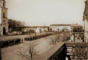 W ubogiem, trawionem nieustannie pożogą, mieście, daremnie szukać zabytków przeszłości, gmachów okazałych. Widok ten aż nadto uwidocznia nasze słowa: ma to być bowiem ulica „pryncypalna”. Przy dostatecznem powiększeniu obrazu można odczytać na domu narożnym szyld wyłącznie w języku rosyjskim. Takie były przed kilku laty wszystkie, szyldy w całej gubernji. Wyrzucono szyldy polskie już przed 40-tu z górą laty, za gubernatora Gervais'go.